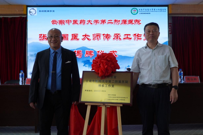陈祖琨书记、田春洪教授为“国医大师张震云南中医药大学第二附属医院传承工作室”揭牌。
