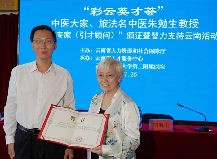 云中二院讯(通讯员 王馨苑)7月26日上午,由云南省人力资源和社会保障厅主办,云南省人才服务中心联合云南中医药大学第二附属医院组织开展的“彩云英才荟”——中医大家、旅法名中医朱勉生教授“特聘专家(引才顾问)”颁证暨智力支持云南活动在医院22楼学术报告厅举办。