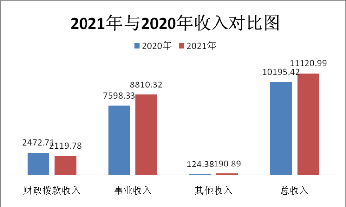 云南中医药大学第二附属医院部门2021年度收入合计11,120.99万元。其中:财政拨款收入2,119.78万元,占总收入的19.06%;事业收入8,810.32万元,占总收入的79.22%;其他收入190.89万元,占总收入的1.72%。2020年度收入合计10195.41万元。其中:财政拨款收入2472.71万元,占总收入的24.25%;事业收入7598.33万元,占总收入的74.53%;其他收入124.38万元,占总收入的1.22%。2021年与上年相比年收入增长了926.58万元,增幅9.09%,其中:财政拨款收入下降了352.93万元,降幅14.27%,事业收入增长1211.99万元,增幅15.95%,其他收入增幅66.51万元,增幅53.21%。增减原因为:1.财政拨款收入下降的主要原因为拨付的专项资金较上年减少。2.事业收入增长,医院主要的事业收入为医疗收入,医院近年来不断提升医疗服务能力,改善医疗服务结构,加大临床科室规范行医的指导及监督,这些措施的落实促使医院医疗业务收入按照10%的比例逐年增长。3.租金收入增长原因为医院加强出租出借的实地管理,提高国有资产使用效率,同时对现有出租的单位及个人积极开展租金催收工作。