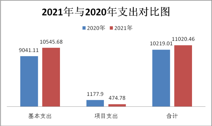 云南中医药大学第二附属医院部门2021年度支出合计11,020.46万元。其中:基本支出10,545.68万元,占总支出的95.69%;项目支出474.78万元,占总支出的4.31%。2020年度支出合计10219.01万元。其中:基本支出9041.11万元,占总支出的88.17%;项目支出1177.90万元,占总支出的11.53%;医院无上缴上级支出、经营支出、对附属单位补助支出。2021年较上年相比,总支出增加了801.45万元,增幅为7.84%,其中,基本支出增长1504.57万元,增幅16.64%,项目支出下降了703.12万元,降幅59.69%。总支出增减原因,一是医院认真贯彻2019年省卫生健康委下发的35号文件精神,积极推进绩效工资改革,按照医院绩效考核方案执行绩效工资分配,医院本年度绩效增幅明显;二是医院就诊人次增加,带来的运转支出同时增加,如药品消耗、卫生材料消耗、水、电等一般运转经费随之增加;这些是导致支出增长的主要原因。