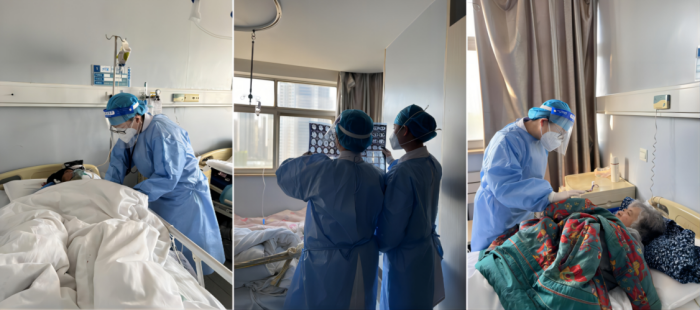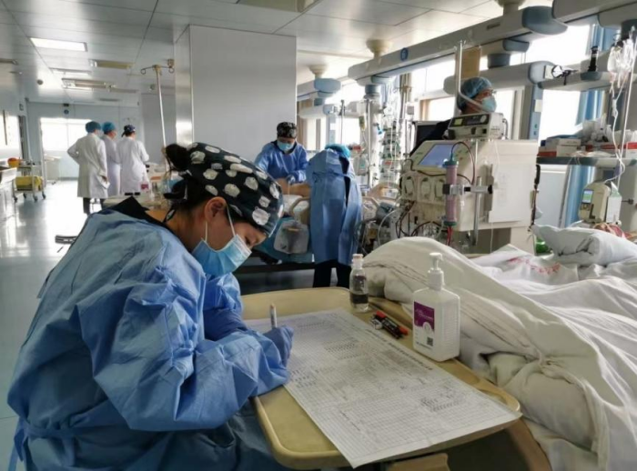 十二月上旬开始,急诊、重症患者成倍增加,重症医学科全体医护人员加强危急重症患者监护。每个日夜均守候在患者病床前全力救治,处于高热疼痛中的医生仍为患者插管,烧得满脸通红的护士仍一丝不苟地为患者抽血化验、排痰护理。年轻的护士阮俊雯,主动请缨投入到最紧张艰苦繁重的病患护理工作中,冲在战疫一线用实际行动展现年轻人的使命与担当。