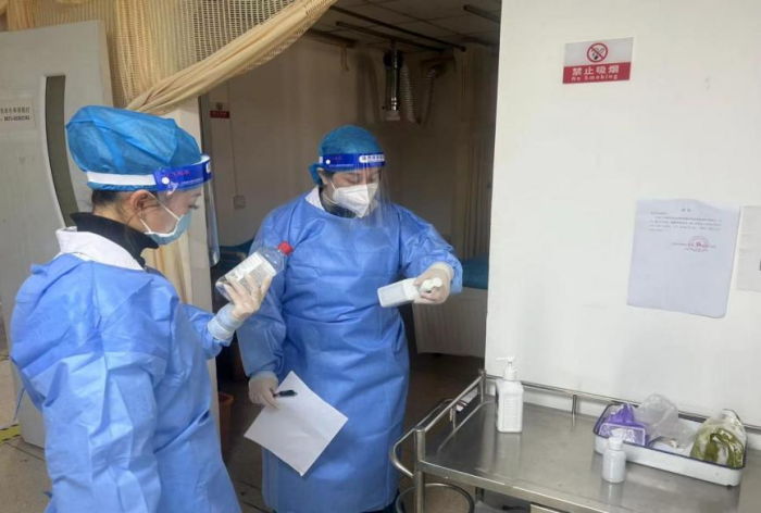 经历了5天封闭隔离的神经内科一科全体医护人员,他们同时兼有医生、护士、保洁员、消毒员、送餐员的身份,不仅要保障正常的诊疗救治工作,还要承担起为患者及家属开展核酸检测、病区卫生清扫、安排患者三餐、病房消毒等一系列工作,5天没走出科室没回家。没有清洁员,医护人员一间一间打扫病房分类打包收集垃圾;没有消毒员,护士用治疗车拉着消毒箱一间一间进行病房消毒;没有送餐员他们为每位患者订餐送餐。在全科的共同努力下,实现了隔离人员无一人感染。