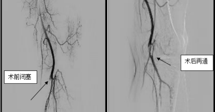22岁小伙子平时喜欢久坐玩游戏,且经常跷“二郎腿(左脚在上)”。2月前发现左下肢疼痛、麻木、发凉,行走1公里或者跑步数十米即出现上述症状,休息后缓解,在外院行下肢血管CTA检查示:左侧腘动脉闭塞,口服药物治疗无缓解而入住我院。行相关检查排外心源性栓塞及血管炎等因素后,经专家团队充分讨论,给予行左侧闭塞腘动脉介入治疗,使用导丝通过闭塞段血管后行球囊扩张成形术,手术顺利,术后血流恢复好,间歇性跛行症状明显改善。
