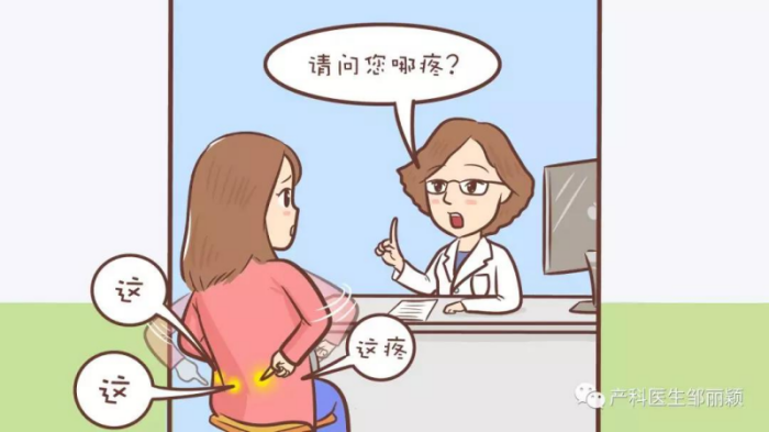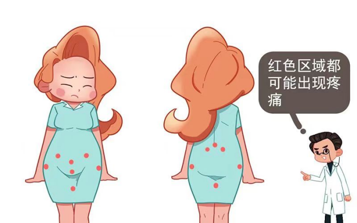 2.刺痛、锐痛、钝痛或烧灼样痛的区域主要集中在骼关节、一侧或双侧臀部、下肢背侧和耻骨。患者在步行、转身及爬楼梯时会有疼痛感。有时耻骨处会出现咔嗒声或摩擦音,造成站立后行走困难。夜间平躺、翻身或抬腿下床时,不适感更强烈。合并腰背部疼痛和骨盆疼痛的女性活动更加受限,往往需要借助手杖或者拐杖才能活动