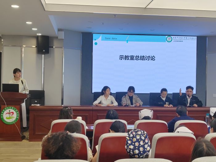 本次示范讲座由老年病科护士长李琪艳主持,带教老师张碧芳携该科4位护理实习生以帕金森患者为例,围绕疾病概述、病因、发病机制及临床表现,融入以问题为导向的PBL教学法,引导四位护理实习生进行体格检查及病例讨论,进而提升学生的临床实践思维与能力。