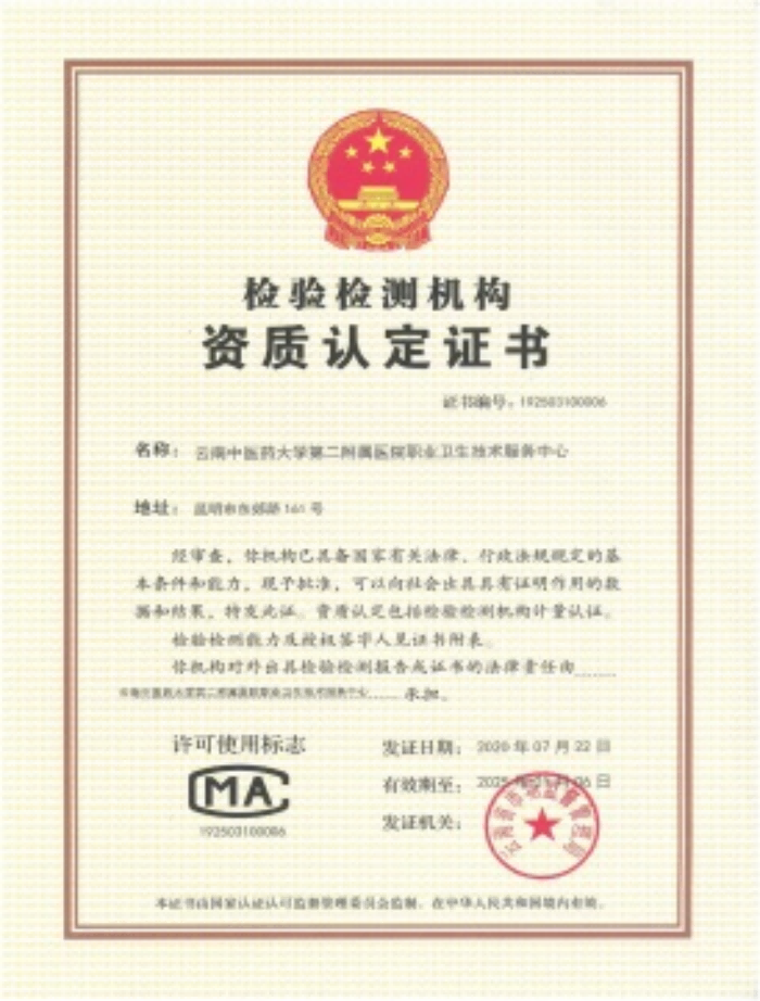 通过云南省市场监督管理局CMA认证的检测因素有141项,拥有涵盖化学因素、物理因素、生物因素的采样、测量、实验分析的设备共计175台。