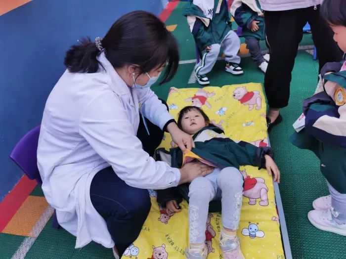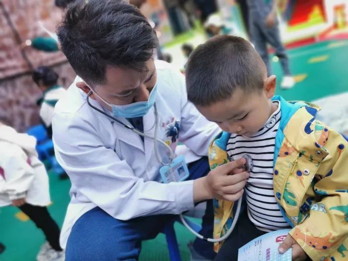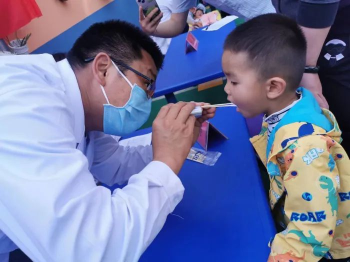 义诊现场,医护人员为幼儿园各年级100余名儿童进行了身高、体重测量、视力检查,对儿童常见的斜视、龋齿进行了筛查,对孩子的心、肺、腹部进行了体格检查。并对可能存在斜视、龋齿、发育迟缓等症状的孩子给予了预防性的医疗指导。