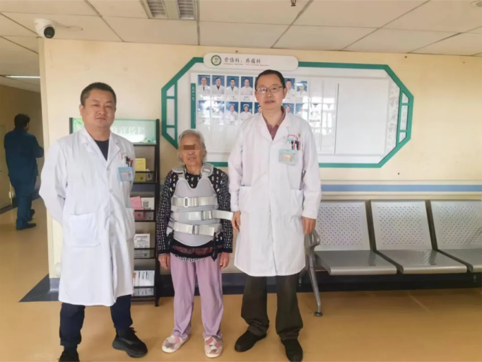 79岁的晏奶奶半月前无明显诱因出现腰背部疼痛,翻身困难,不能下床活动。5月6日坐轮椅到医院骨伤科、疼痛科就诊,就诊时腰部明显压痛、叩击痛,经核磁共振检查诊断为“骨质疏松伴有T12、L1病理性骨折”。鉴于奶奶身体基础稍差,征得奶奶及家属同意,决定为奶奶实施微创手术“经皮穿刺椎体后凸成形术(PKP)”。术后第一天,奶奶疼痛明显缓解,佩戴腰围下床活动,独立行走。