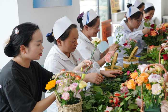 活动现场,花香四溢,气氛热烈。医院女职工们齐聚一堂,以花为媒,共抒爱国情怀。在专业花艺师的指导下,大家认真挑选花材,精心搭配,将一朵朵鲜花编织成一幅幅寓意深远的插花作品。活动中,女职工们不仅交流了插花技巧,更分享了各自的工作与生活感悟,展现了新时代女性的独立、自信与担当。