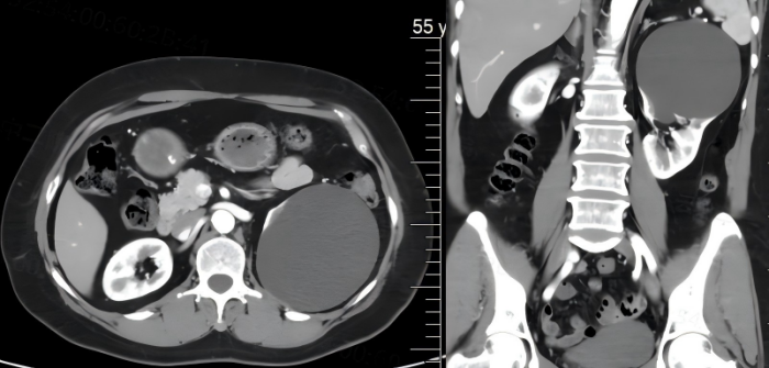 近日,医院外科团队成功为一名55岁女性巨大肾囊肿患者实施经后腹膜腹腔镜下左肾囊肿去顶减压术。