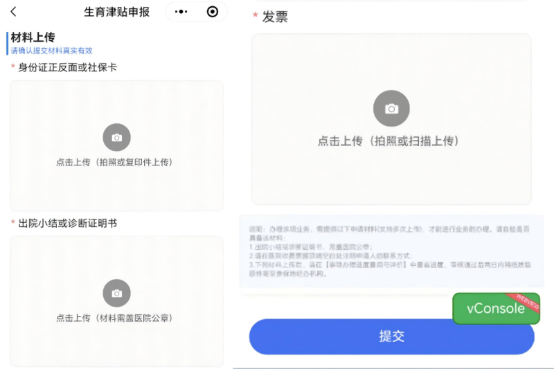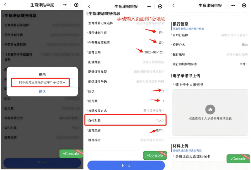 若参保人获取不到结算信息,进入功能后,手动填写必填项,签署承诺书、上传附件后提交生育津贴申请。