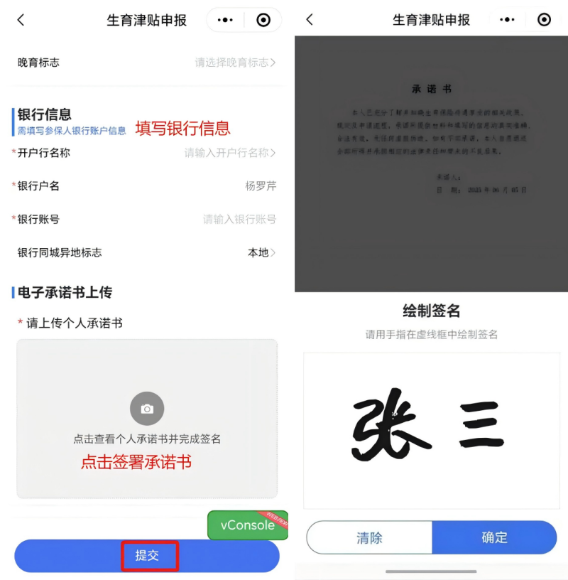 3.填写银行信息,签署承诺书后,点击“提交”。