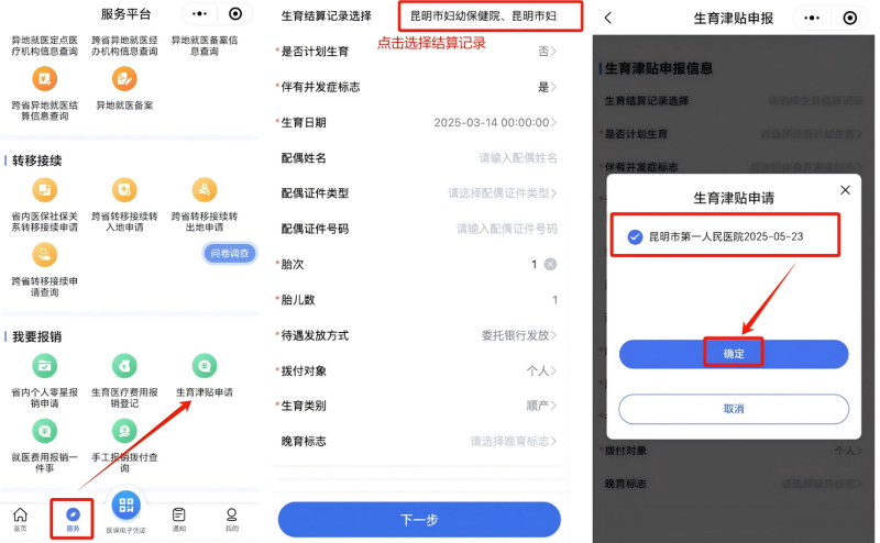 2.点击【服务】页面,点击“生育津贴申请”,点击“生育结算记录选择”,勾选生育结算信息。选择后系统自动带出就医信息,参保人补充剩余未带出字段,点击“下一步”。