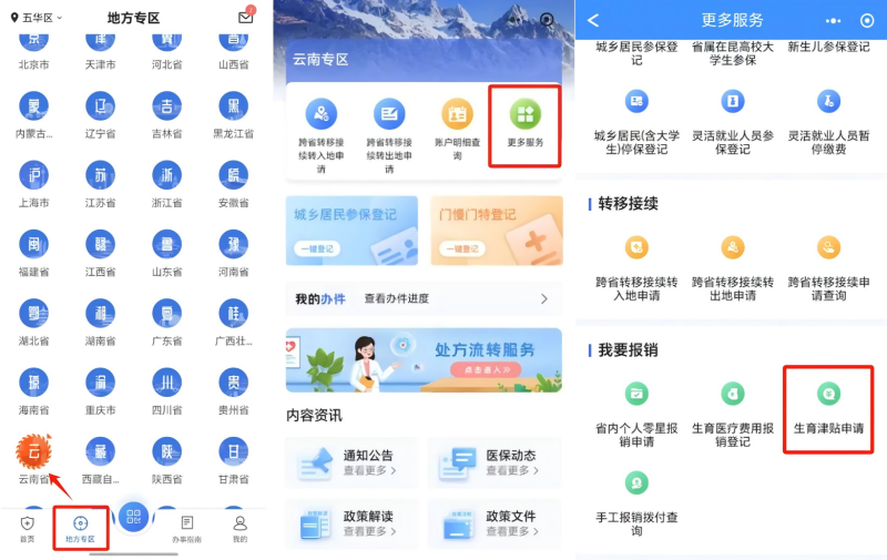 3.进入云南专区,进入云南专区后,点击“更多服务”,找到“生育津贴申请”;