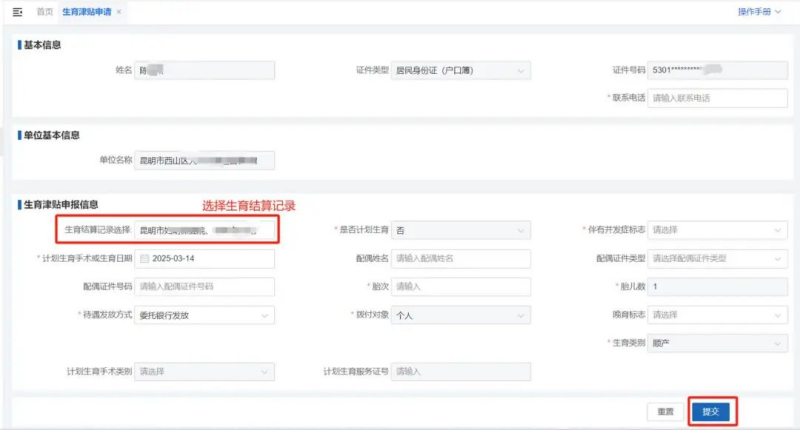 5.点击“生育结算记录选择”,选择生育信息后,补充完善剩余必填项,点击“提交”。