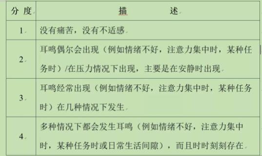 4、耳鸣严重性分级。耳鸣的严重程度可以使用多项耳鸣问卷评分进行评分。Biesinger等人的结构性耳鸣问卷,根据损伤的程度和频率将耳鸣严重程度分为四个等级。