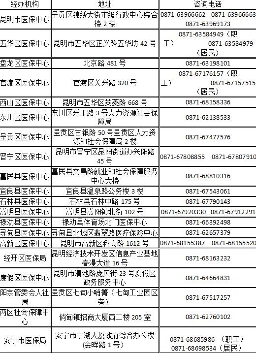 答:参保人也可以拨打云南人社咨询服务热线12333进行咨询了解。昆明市医保经办机构固定电话如下: