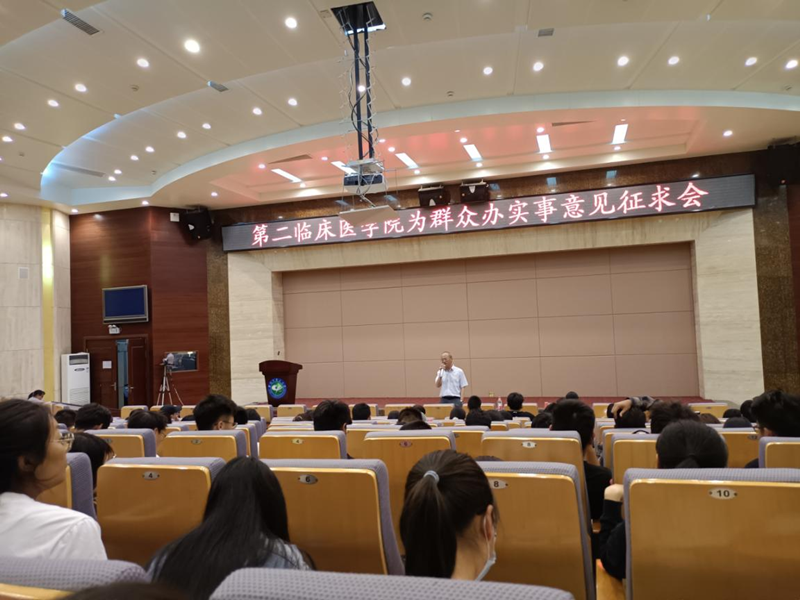 云中二院讯(通讯员 杨艳芳)为深入开展党史学习教育,切实开展“我为群众办实事”实践活动,在第二临床医学院党委领导下,2021年5月6日晚,在翰墨楼一楼报告厅组织开展了2020-2021学年第二学期第9次师生面对面交流暨“为群众办实事”意见征求会。会议由第二临床医学院党委副书记杨剑南主持。院长邰先桃教授,2017级本科生辅导员杨艳芳,2020级研究生及2017级针灸推拿学专业本科生200余人参加。