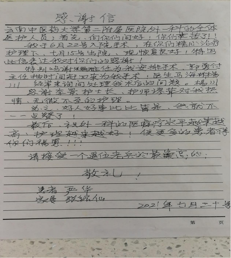 云中二院讯(通讯员 缪茸)7月20日上午云南中医药大学第二附属医院外一科收到一封来自患者的感谢信!患者及家属由衷感谢外一科医护人员认真负责的诊治和细心周到的护理,并高度赞扬了主任张毓珩和医护团队的精湛医疗技术及新时代职业精神。