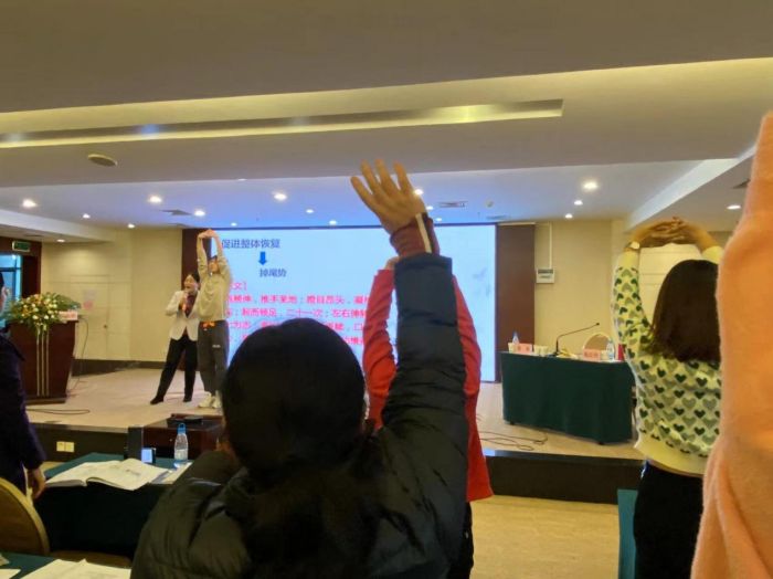 邰教授从“中医传统功法的特点”、“脑血管疾病康复的难点”、“中医传统功法的临床应用”三个方面进行了简明扼要的讲解,提出脑血管疾病的康复应“防大于治”,以中医“治未病”思想为基础,遵循中医“整体观念”和“辨证论治”的特点,阐述了中医传统功法应用于防治脑血病疾病的优势。讲授过程中,邰先桃教授理论联系实践,还带领学员们一起习练降压保健操、云中养生易筋经、脊柱简易保健操等简便效验的锻炼方法。