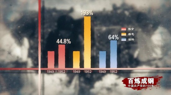 同1949年相比,1952年粮食产量增长44.8%,棉花增长193%,油料增长64%。