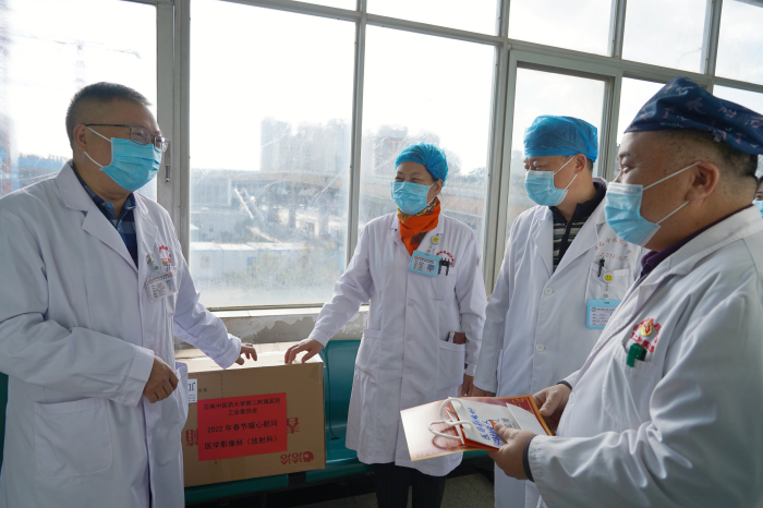 云中二院讯(通讯员 何晓阁)在2022年新春佳节前夕,1月28日上午,院党委书记陈祖琨、院长邰先桃、党委副书记杨剑南、副院长、院工会主席罗启德、副院长范源、葛良栋代表医院工会委员会深入临床一线科室看望慰问春节期间坚守岗位的一线医务人员及25个一线值班科室,向他们送去了慰问品、慰问信,并致以新春的祝福和问候。