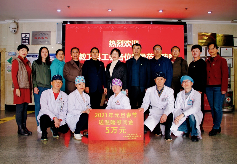 2021年2月5日下午,省教育卫生科研工会女工主任田咏华、劳动技术部部长魏福到医院走访慰问春节值守的一线教职医务员工,并代表云南省总工会、省